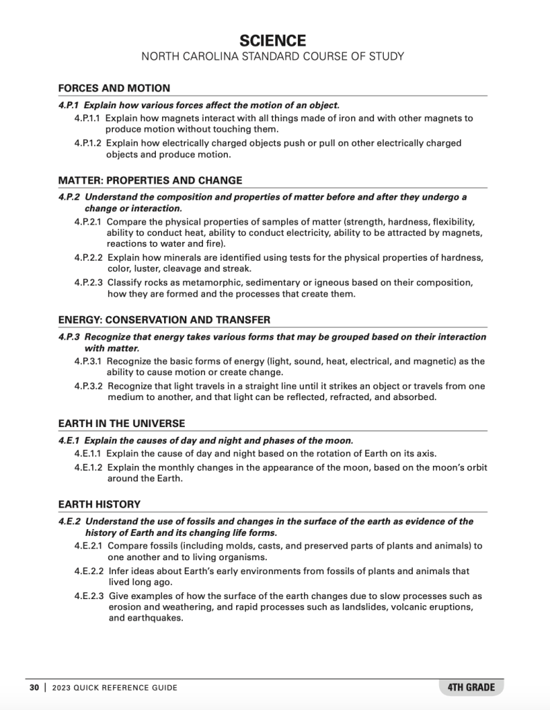 Every state has a set of educational standards, which identify content and skills that all public schools are responsible for teaching at each grade level. Here in North Carolina, this is called the North Carolina Standard Course of Study. You can probably get the document you need by Googling “[State name] standards for grade [#].” Here’s what this looks like for fourth grade in North Carolina: