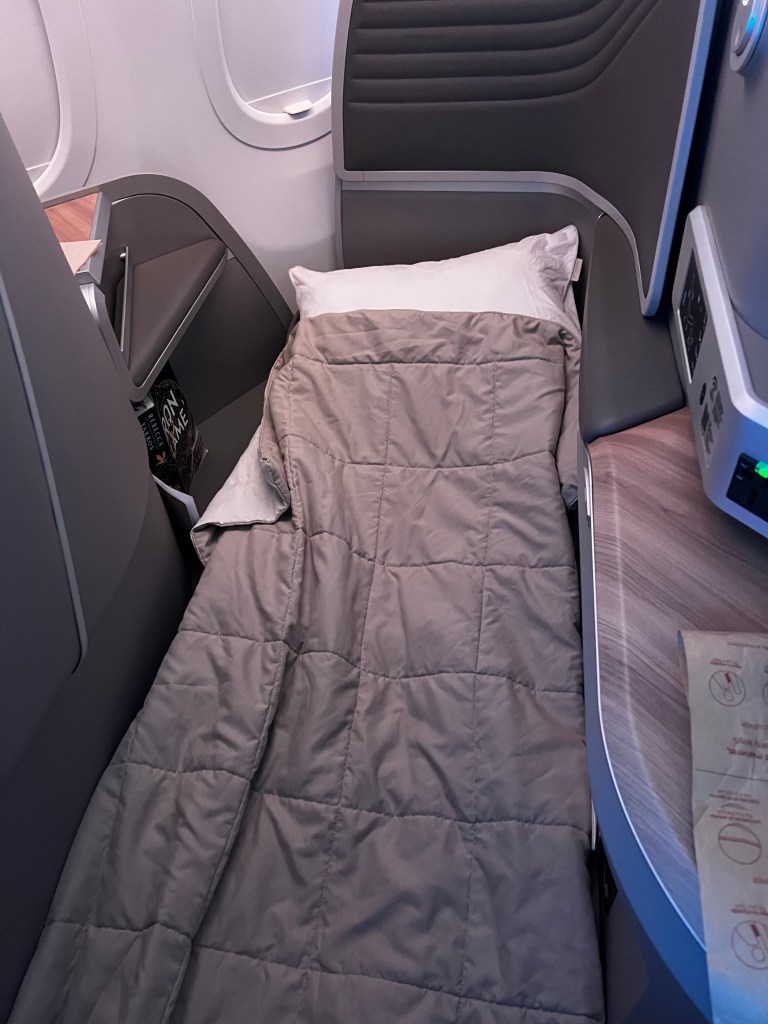 The cabin was a bit warm, but I found the seat very comfortable for sleeping. As a side sleeper, I had enough room to bend my knees. I probably slept for about two hours, and woke just as we were starting our initial descent (so sadly, I can’t report on breakfast).